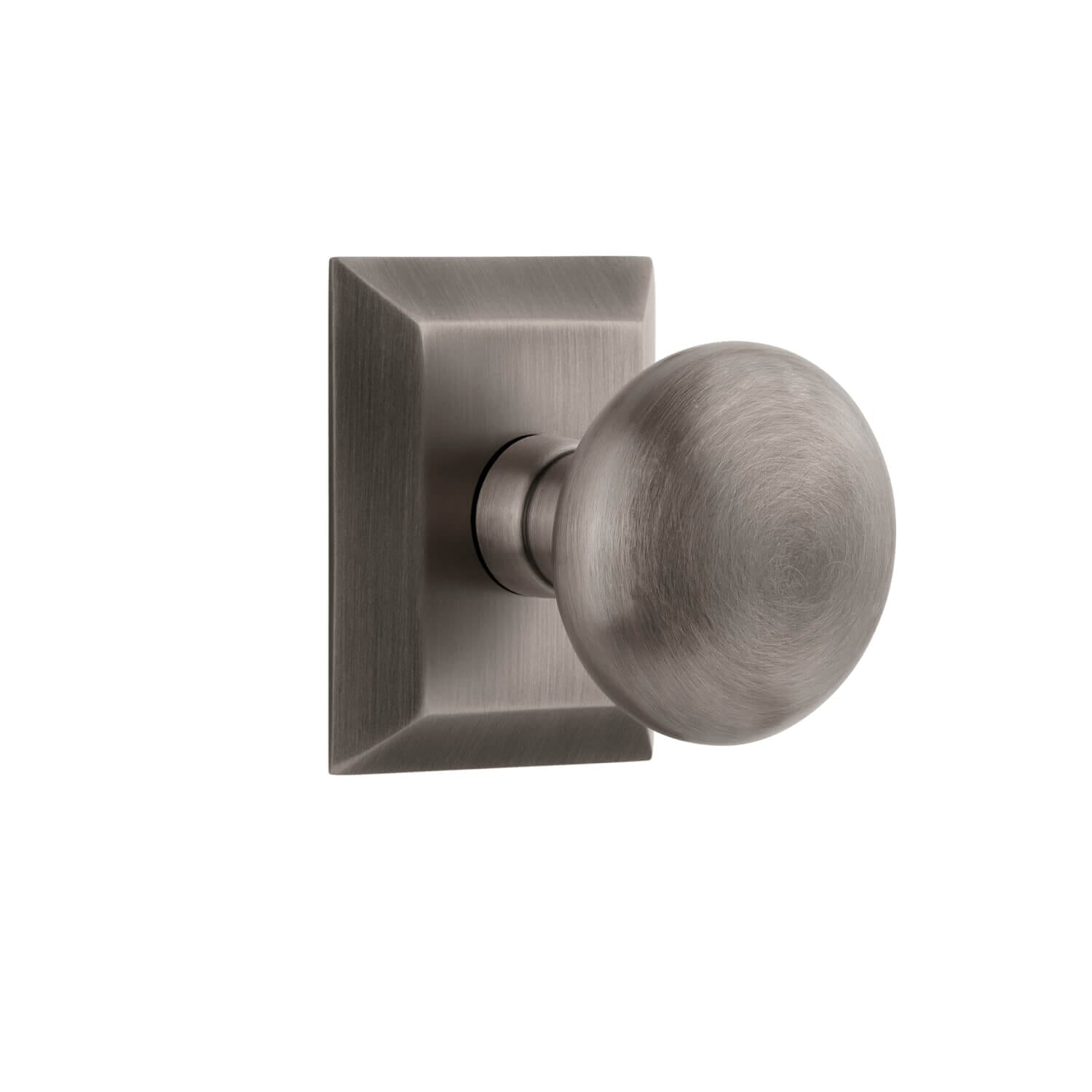 Slightly darker than satin nickel. It’s darkened, then relieved, to give a moderately-aged appearance. Finally, it receives several coats of satin lacquer to freeze its beauty in time