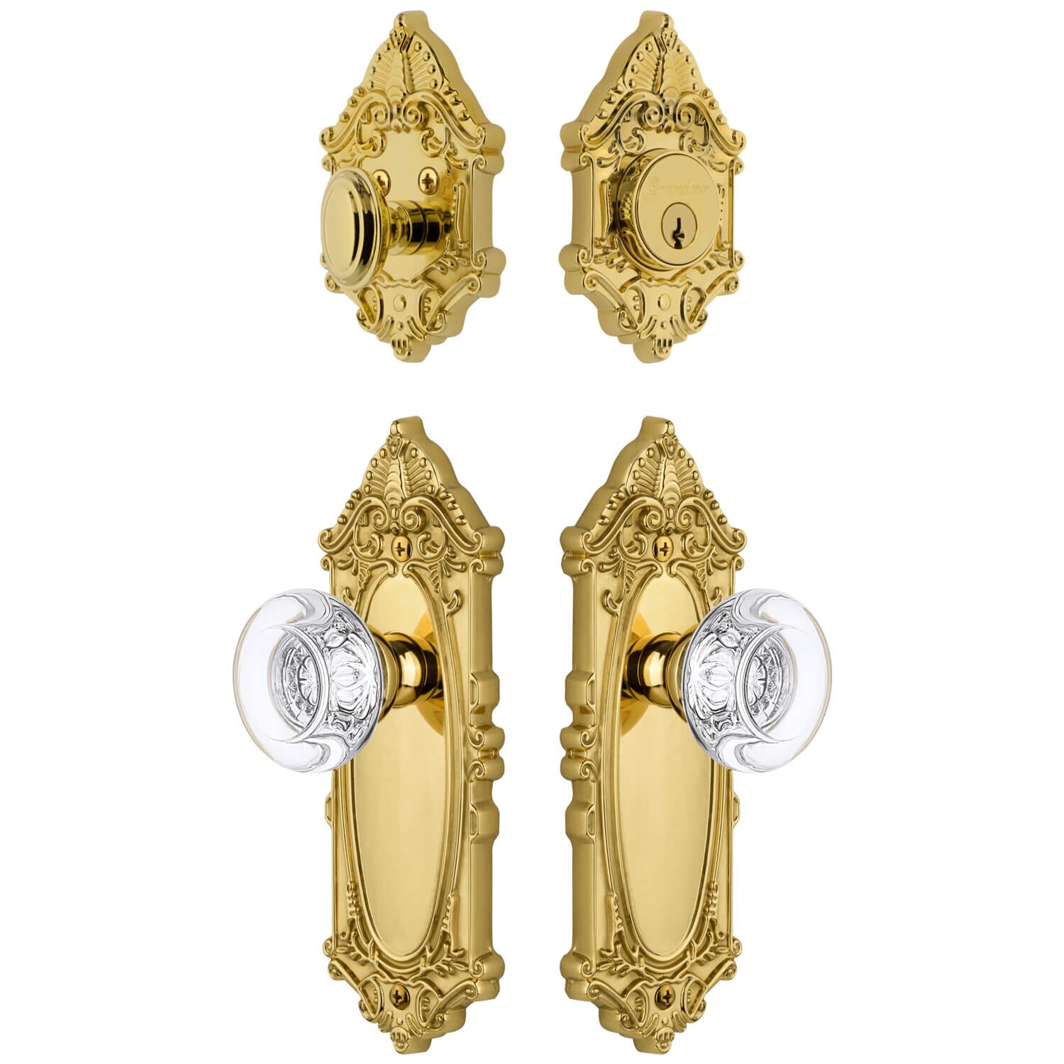 Define your home’s exquisite appeal with the ornate authenticity and impassioned design of the Grande Victorian Plate. Add the Bordeaux Knob and Grande Victorian Deadbolt for a stately composition. All Grandeur crystal knobs are created from lead-free crystal for unparalleled clarity and beauty, and mounted on a solid (not plated) forged brass base.